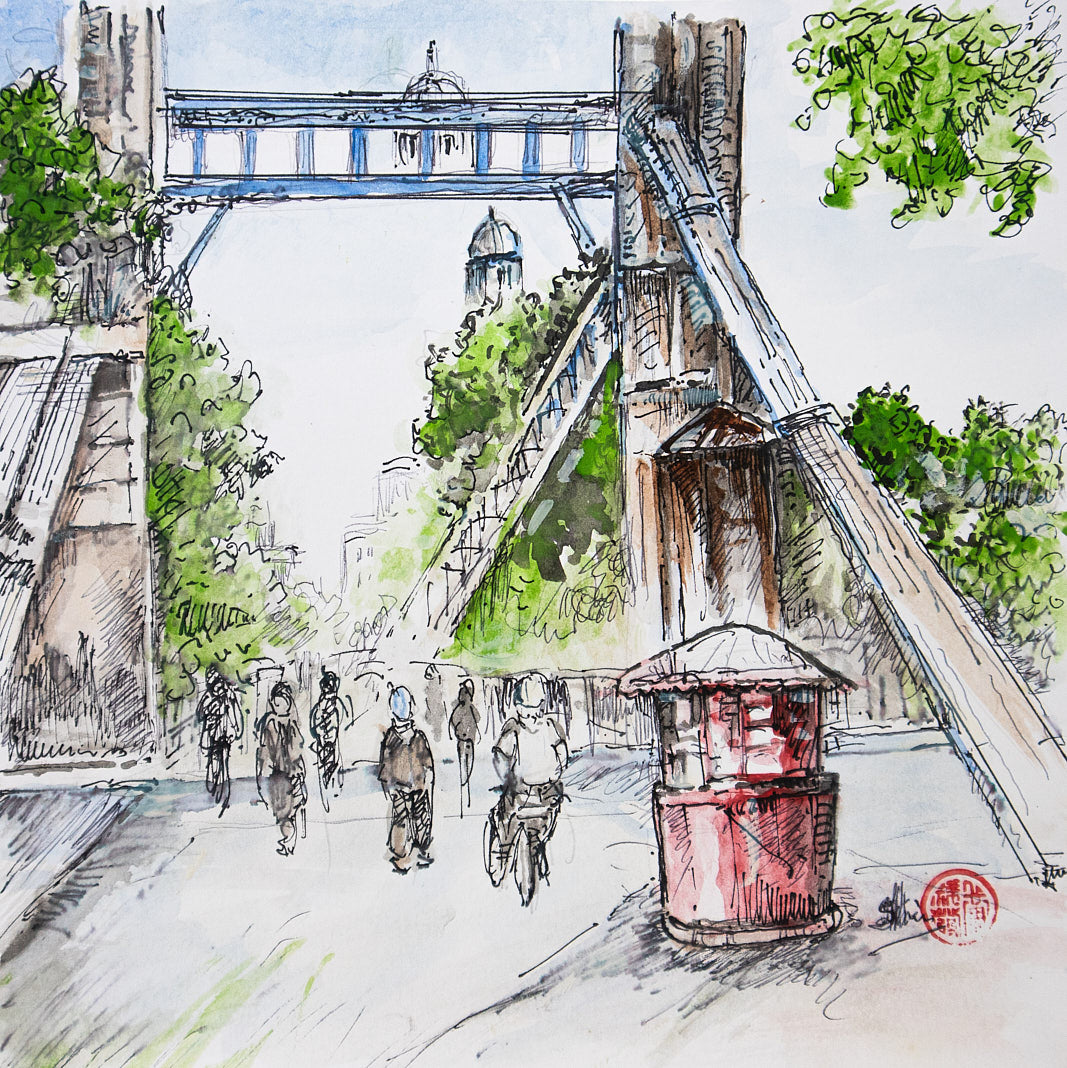 A vibrant sketch captures the essence of a Singaporean scene, where a red kiosk stands sentinel beneath a towering, blue-tinged bridge. Figures stroll along the path, their movements suggested by delicate lines, creating a sense of everyday life unfolding. The artist's hand reveals itself in the expressive brushstrokes, celebrating the interplay of architecture and human activity.
