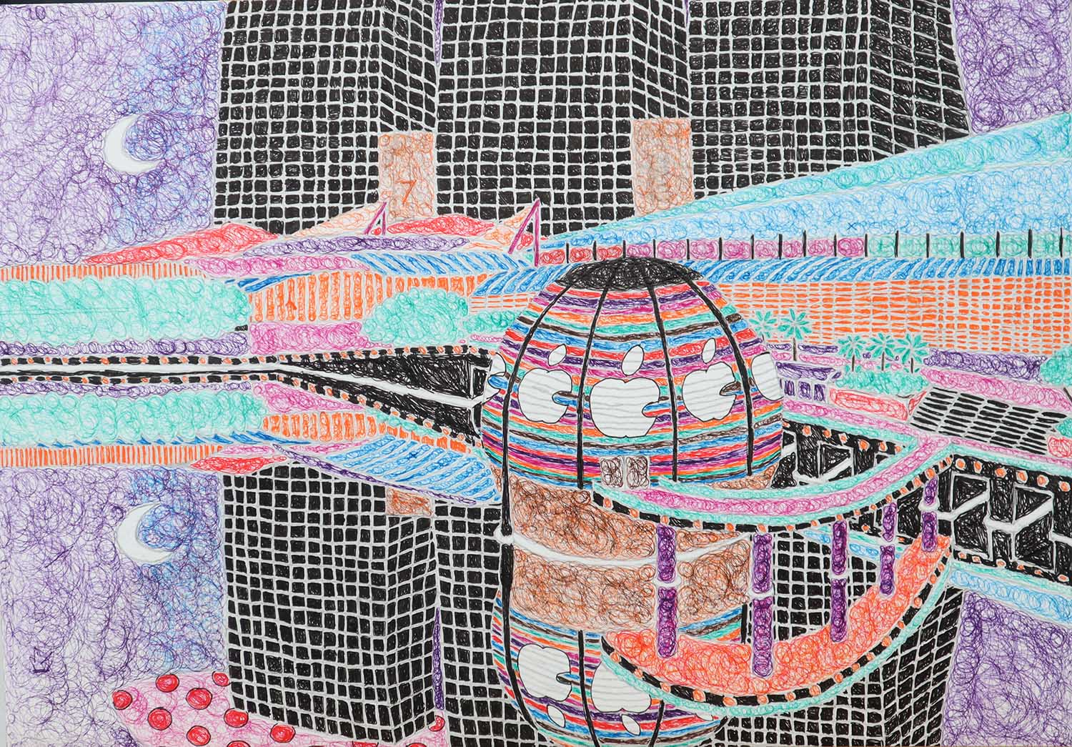 Apple store and Gardens by the Bay by Ezra Chan was inspired by connected iMacs in a study room, illustrates the connectivity of the waterfront area where the Apple Store is situated. The artist utilizes long continuous lines to create texture, depth and detail. The linework, contrasted against the black building façade, emphasizes the lively energy within the area.