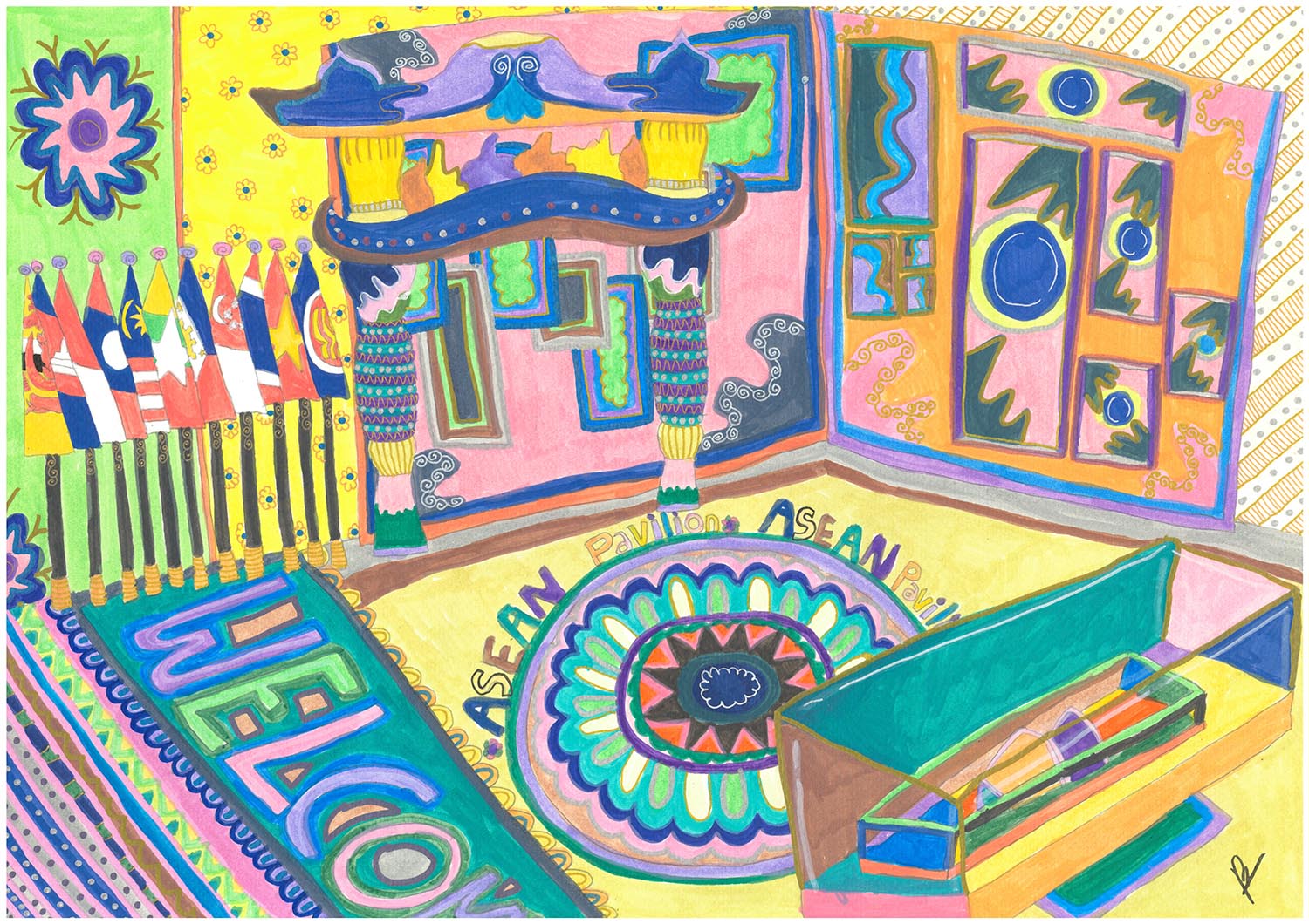 ASEAN Pavilion at Osaka, Japan by Beatrice Goh is a detailed study of architectural space and design on paper. Beatrice uses layered lines and colour to capture the pavilion’s structure and atmosphere. Inspired by the pavilion’s form and cultural significance, her work transforms the scene into a rich, immersive experience—where architecture, perspective, and pattern come together in intricate detail.