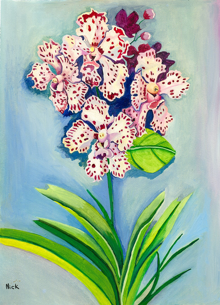 A vibrant splash of color, the orchids burst forth with speckled petals against a serene blue backdrop, their delicate beauty a testament to nature's artistry. The bold strokes and vivid hues celebrate the exquisite details of the flowers, creating a lively and joyful composition.