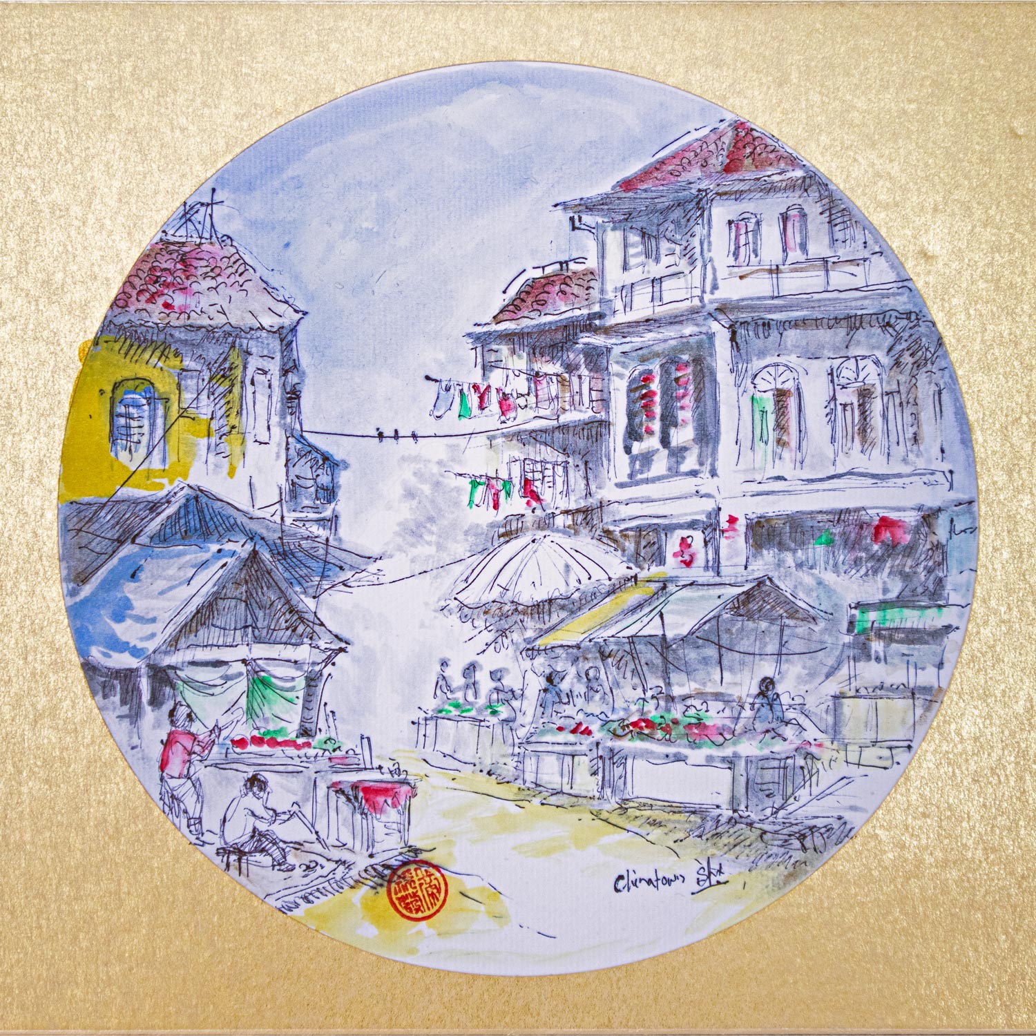 A vibrant Singaporean market unfolds within a circular frame, its bustling energy captured in delicate brushstrokes. Traditional shophouses stand sentinel, their weathered facades whispering tales of bygone eras. The artist's eye reveals a poignant blend of old and new, a harmonious symphony of life and commerce.