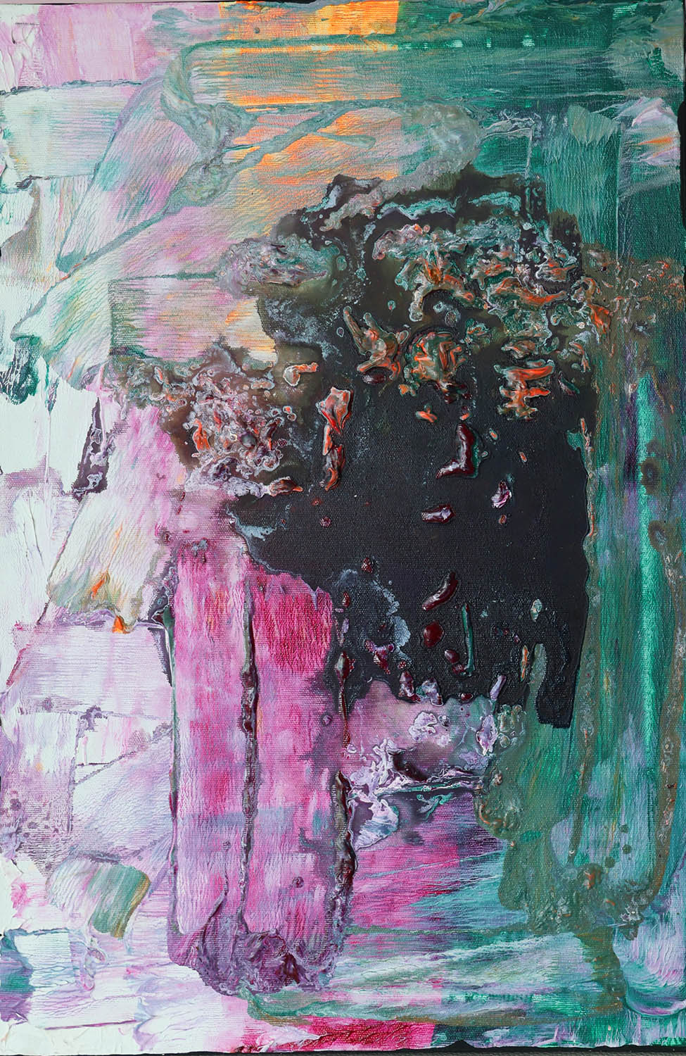 An unguided, self-taught artist, Sebastien used a roller to create Ice Crystal Falls an abstract painting. By spreading paint and water across the canvas at varying angles and configurations, he achieved intense layering that produced distinctive relief effects and clustered “crystals” near the center. The cool color palette inspired the painting’s title.