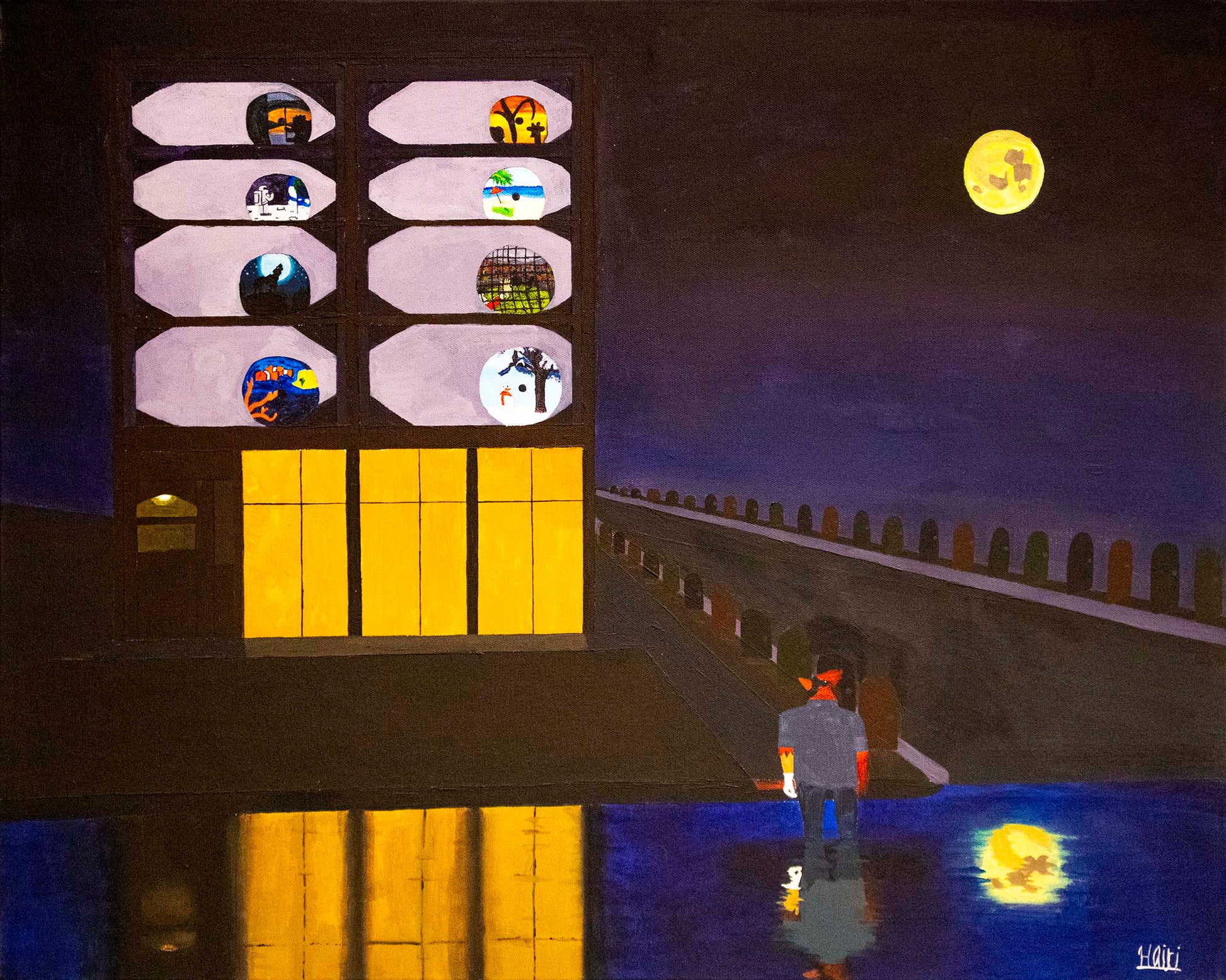 In Memories of a Birdman, Zulkhairi imagines a single lone building set against the night sky, illuminated by a full moon. The building’s brightly lit windows appear like watchful eyes, while a lone figure, the “birdman,” stands on the street gazing upward.