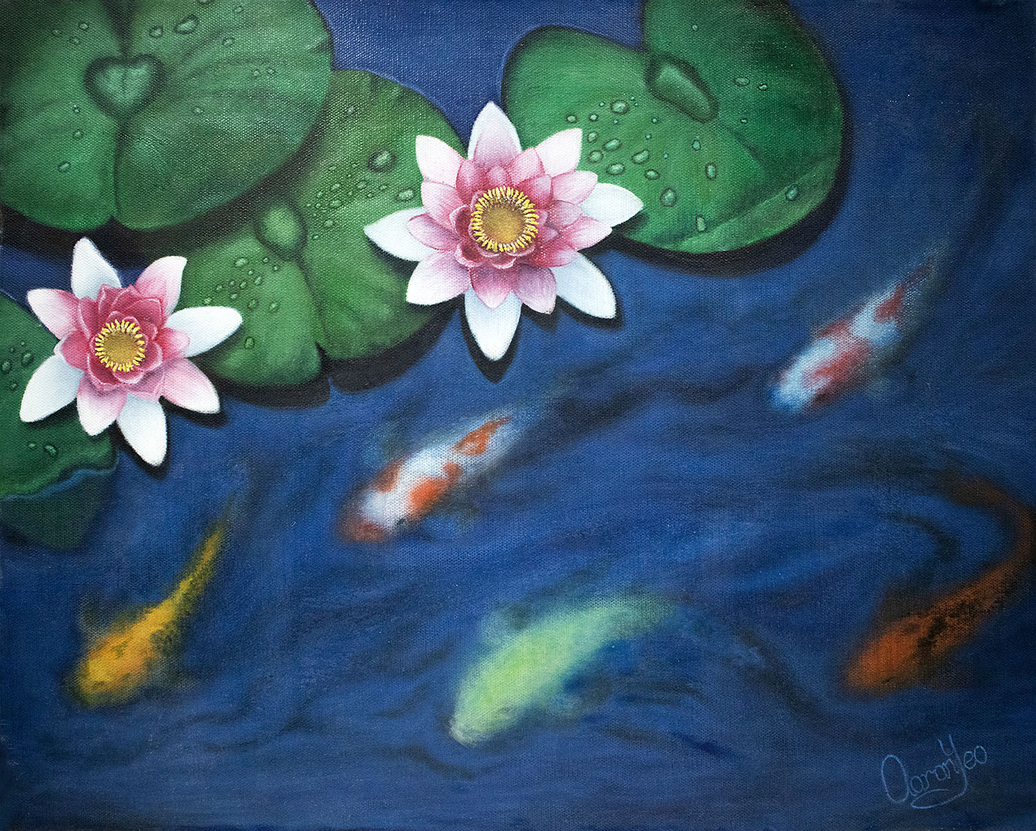 “Morning Dew” portrays a tranquil scene of koi fishes — in shades of red and white, orange, and yellow with delicate striations — gliding gracefully beneath two large lilies and lily pads. The gentle interplay of movement and stillness evokes a sense of harmony and quiet beauty amidst nature’s bloom.