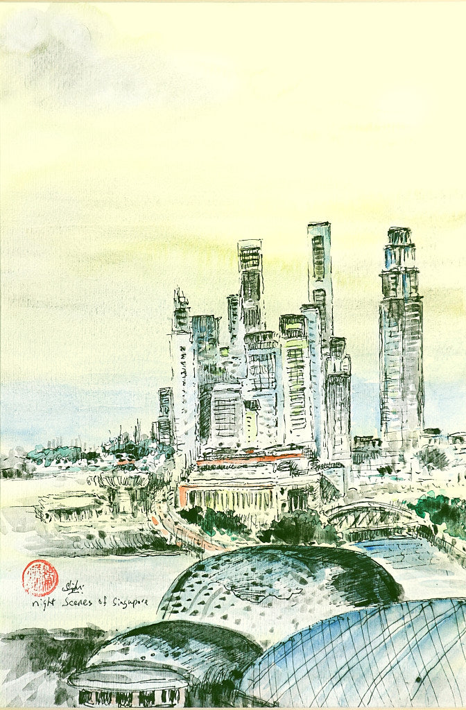 A delicate watercolor captures the essence of Singapore's skyline at night, where towering skyscrapers pierce a soft, hazy sky; the city's energy pulses, reflected in the gentle strokes of the artist's brush. The curved lines of modern architecture contrast beautifully with the sharp verticality of the high-rises, suggesting a harmonious blend of old and new. This artistic rendering evokes a feeling of serene dynamism, a quiet observation of Singapore's vibrant pulse.