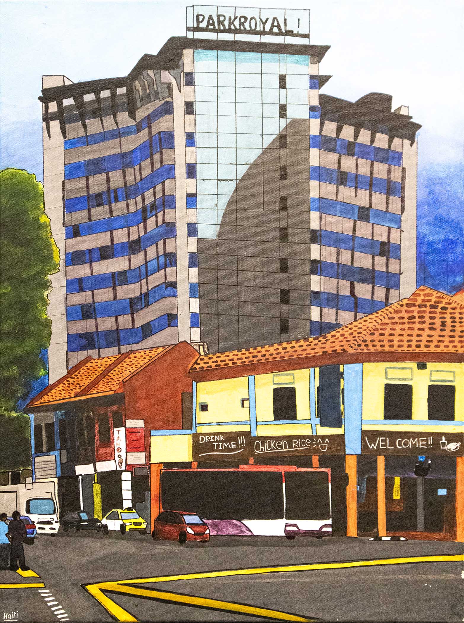 In this painting, Zulkahiri captures the striking contrast between old and new along Kitchener Road. The modern architecture of PARKROYAL on Kitchener Road rises behind a row of traditional shophouses that house a nostalgic coffeeshop, a familiar sight in Singapore’s older neighbourhoods. The warmth and character of the old coffeeshop setting stand out against the sleek, contemporary lines of the hotel, creating a dialogue between everyday life and modern progress.