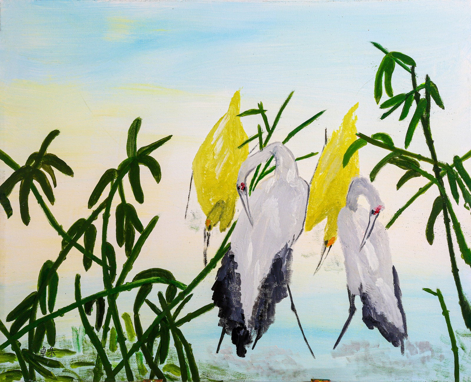This acrylic painting by Toh Ah Wat beautifully captures the grace and beauty of cranes amidst their natural habitat near the waters.