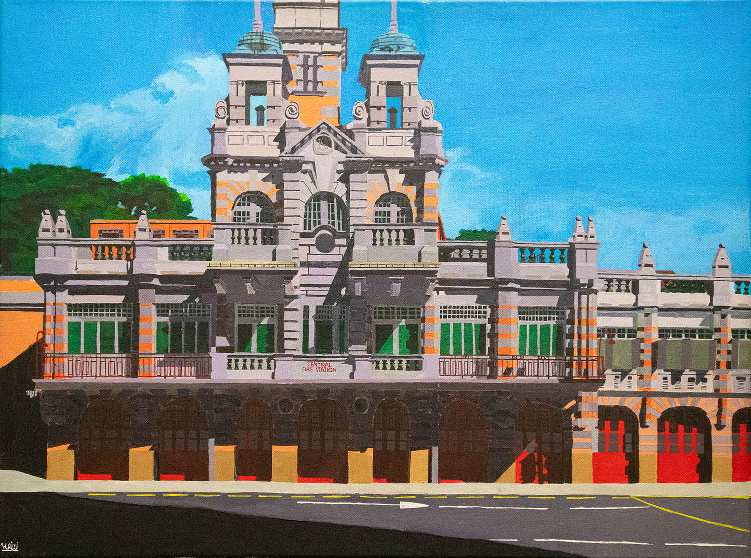 Zulkahiri’s painting of the Singapore Central Fire Station pays tribute to one of the nation’s most iconic heritage landmarks. Built in 1908 during the British colonial era, the fire station is Singapore’s oldest existing fire station and a proud symbol of the city’s civic history. Its distinctive red-and-white brick façade and classical architectural details reflect the style and grandeur of early 20th-century municipal buildings.