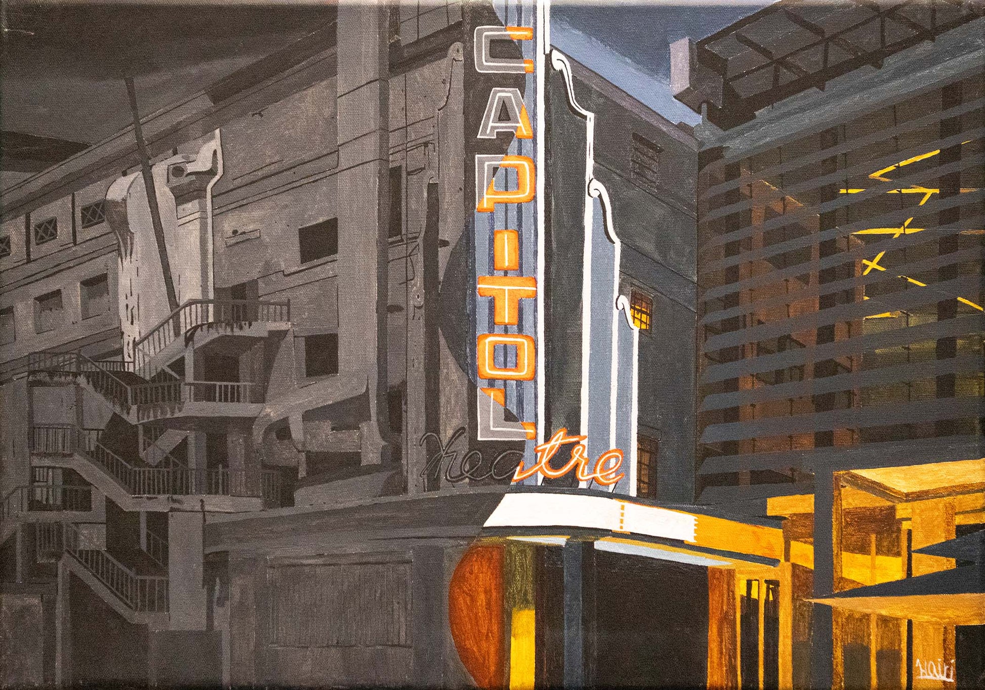 Drawing on his modern realist style inspired by Edward Hopper, Zulkahiri emphasises the architectural forms and textures of both eras. The contrast between the familiar old façade and the contemporary structure is enhanced through composition and colour, capturing a sense of nostalgia while acknowledging the evolving cityscape. Through this piece, he pays homage to Singapore’s architectural heritage and the coexistence of memory and modernity.
