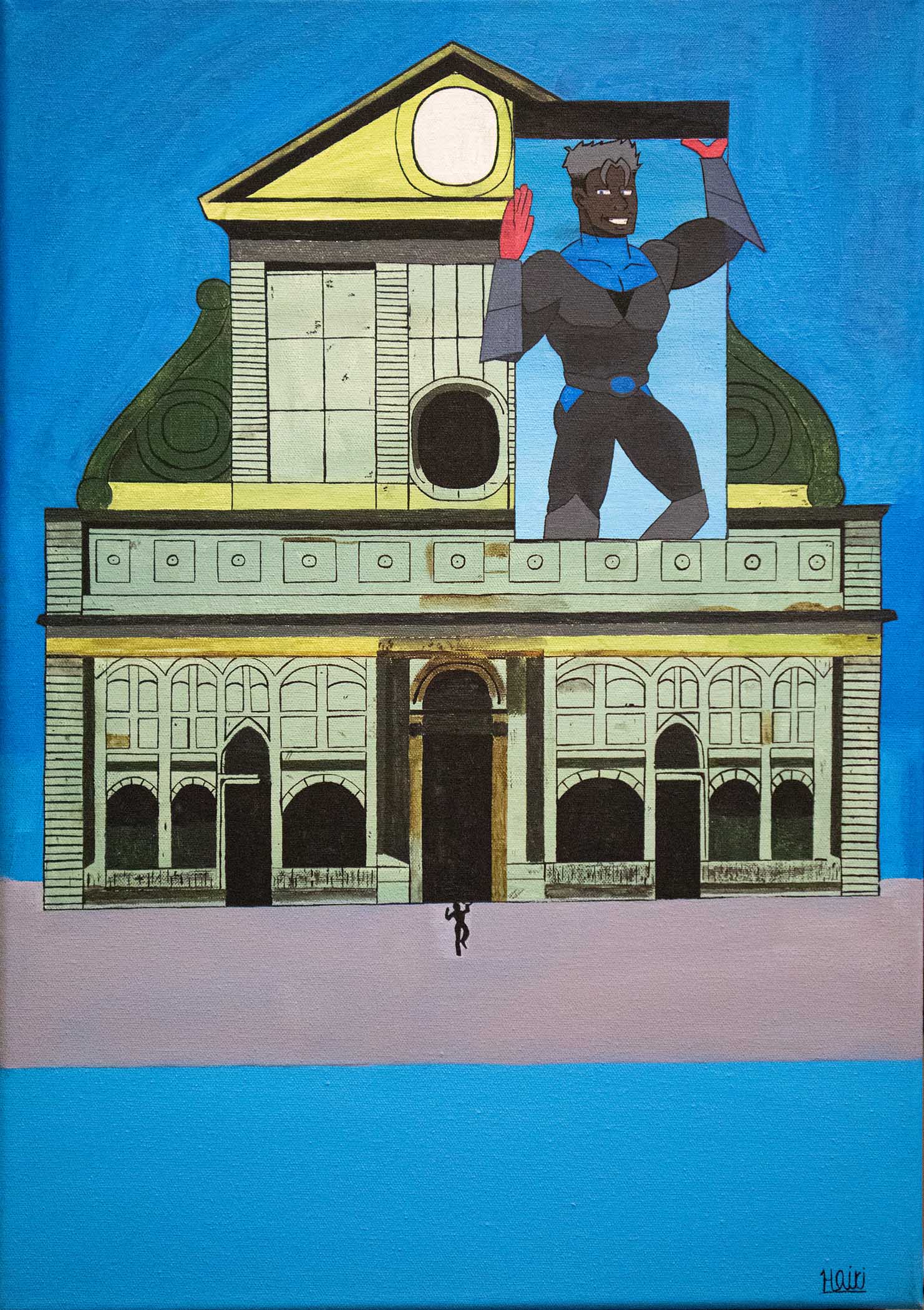 In Series, Beyond The Horizon No. 8, Zulkhairi imagines a superhero lifting an old building, creating a playful and fantastical scene. The composition shows a large, singular historic building carried by the small silhouette of the superhero, while a zoomed-out view in the top right corner reveals the hero smiling toward the viewer.