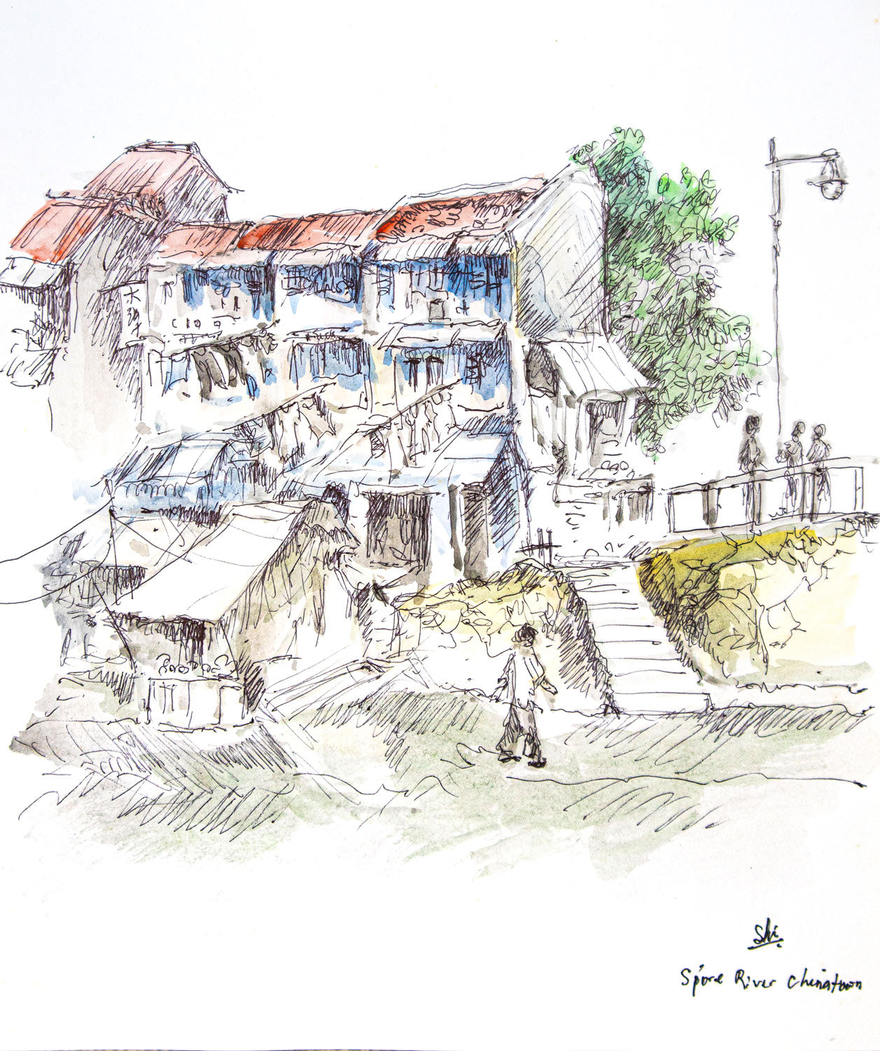 A delicate ink wash captures the essence of Singapore's Chinatown, where weathered shophouses and laundry lines intertwine with the rhythm of daily life, a quiet story unfolding along the Singapore River. The scene whispers of history and the bustling energy of a vibrant, timeless community.
