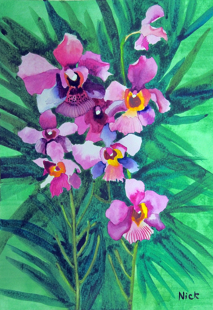 A vibrant watercolor captures a cluster of orchids in full bloom, their delicate petals a symphony of pinks and purples against a backdrop of lush, emerald green foliage. The artist's bold brushstrokes evoke a sense of tropical vibrancy and untamed beauty.