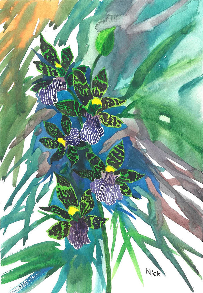 A vibrant watercolor painting captures the exotic beauty of orchids, their dark, speckled petals contrasting against a luminous teal backdrop. The artist uses bold brushstrokes to evoke a lush, tropical atmosphere, emphasizing the flowers' intricate details and the energy of their surroundings.